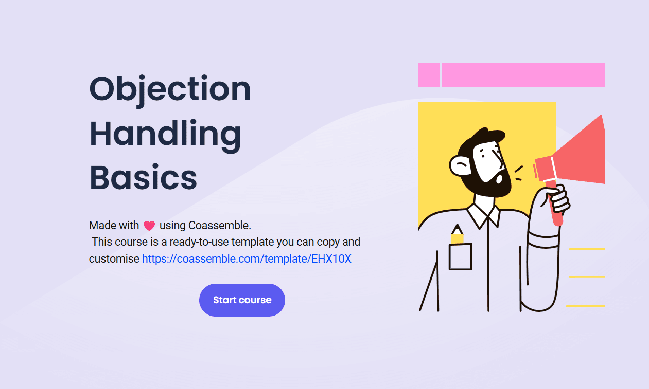 Coassemble's Objection Handling Basics template is a strong real-world example. A sales enablement manager takes existing coaching content and turns it into a structured four-module course, complete with a final assessment. Reps access it on any device, mid-deal if needed.
